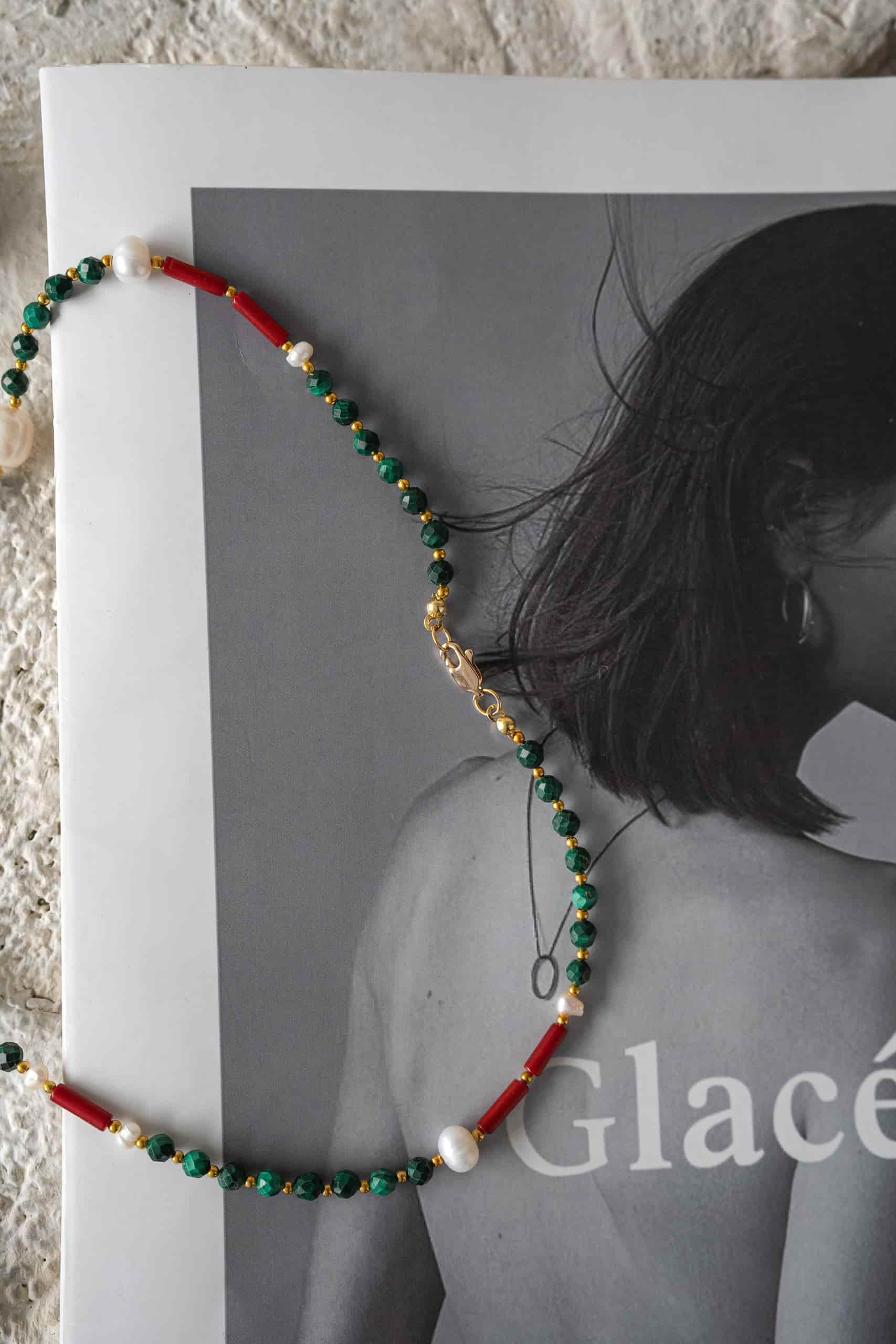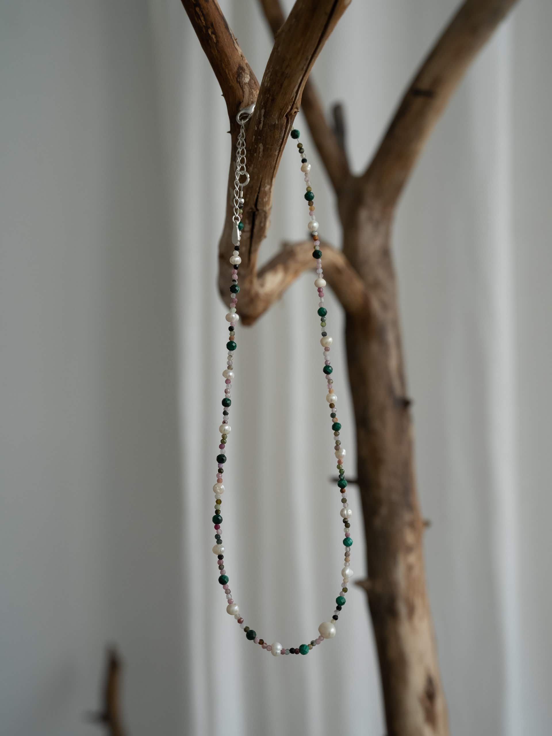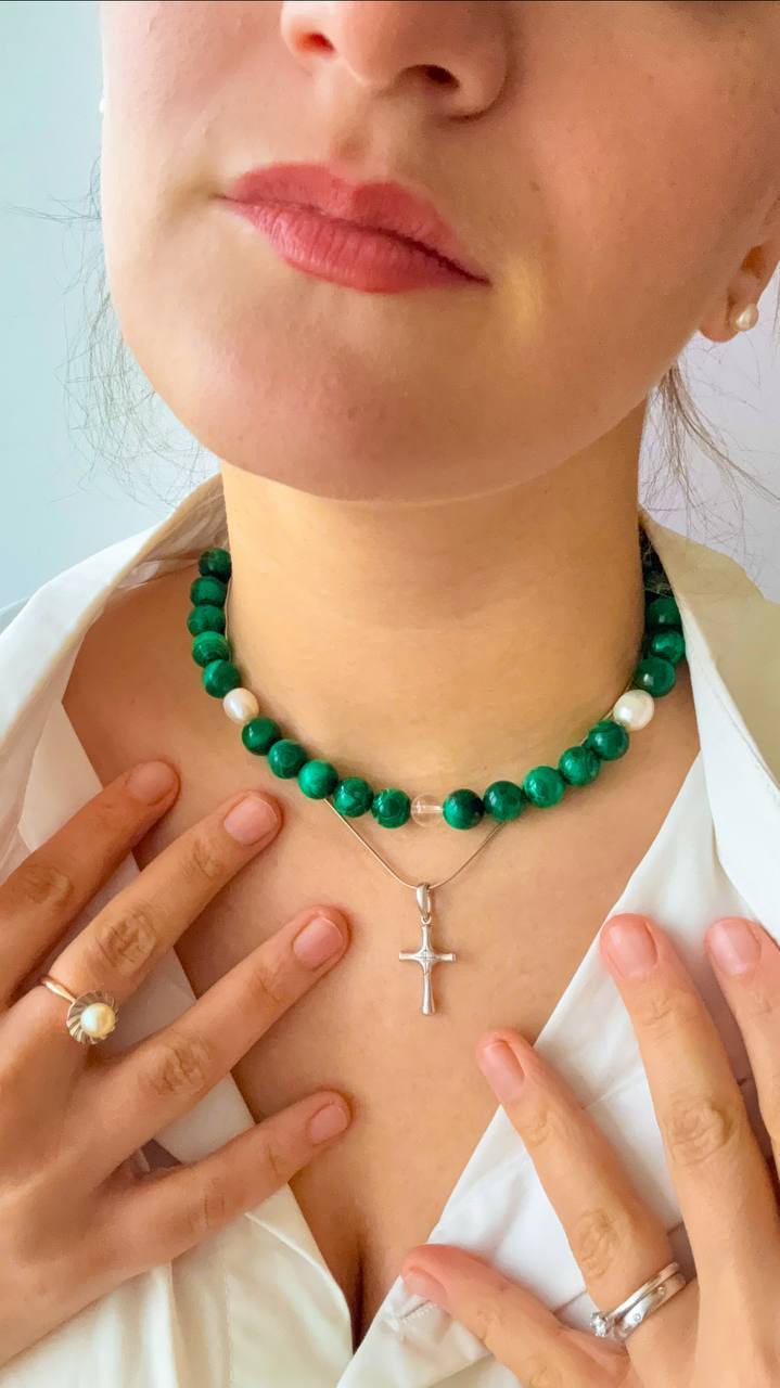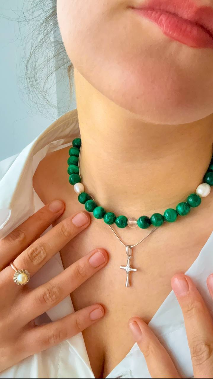 Чокер из турмалина с малахитом и жемчугом
