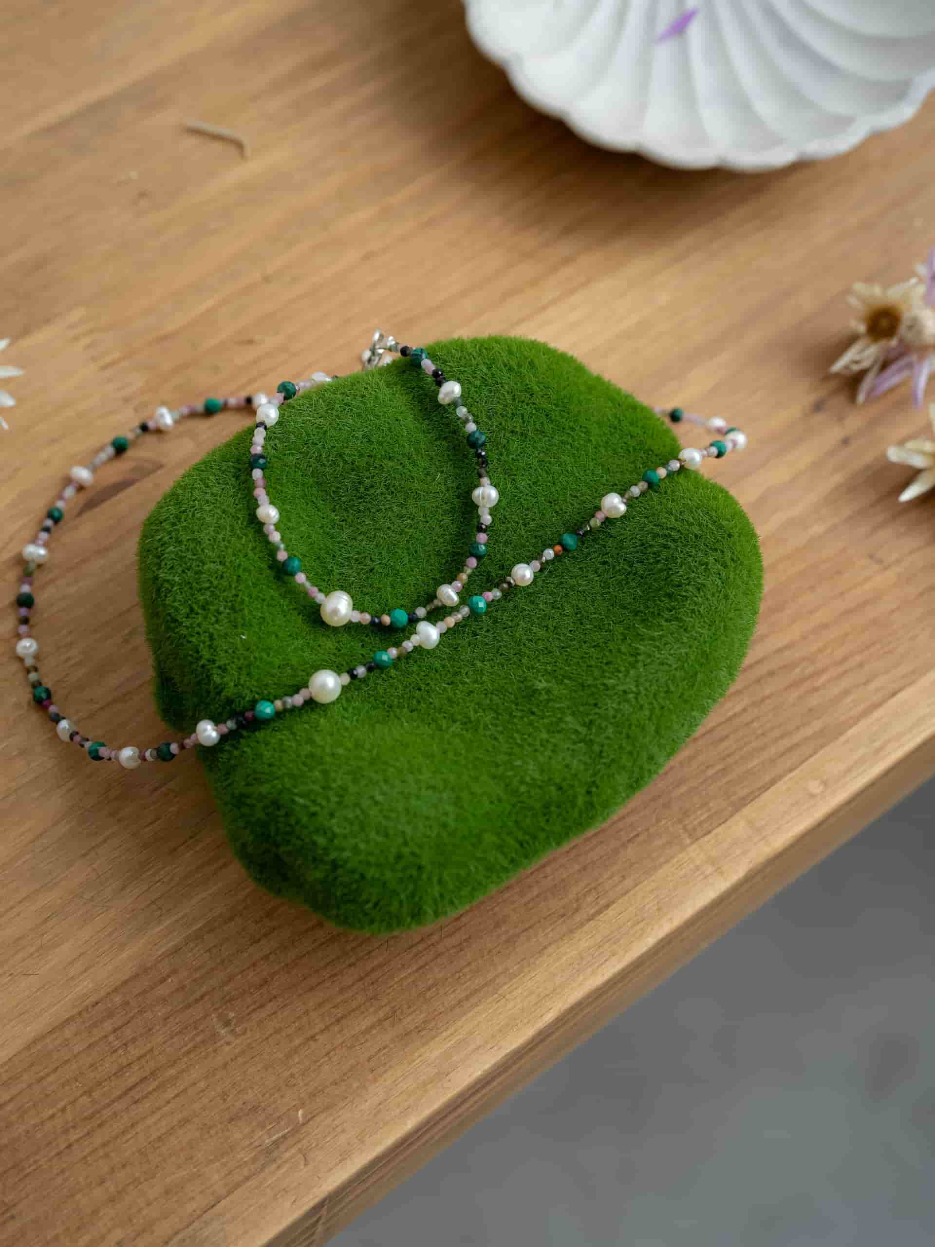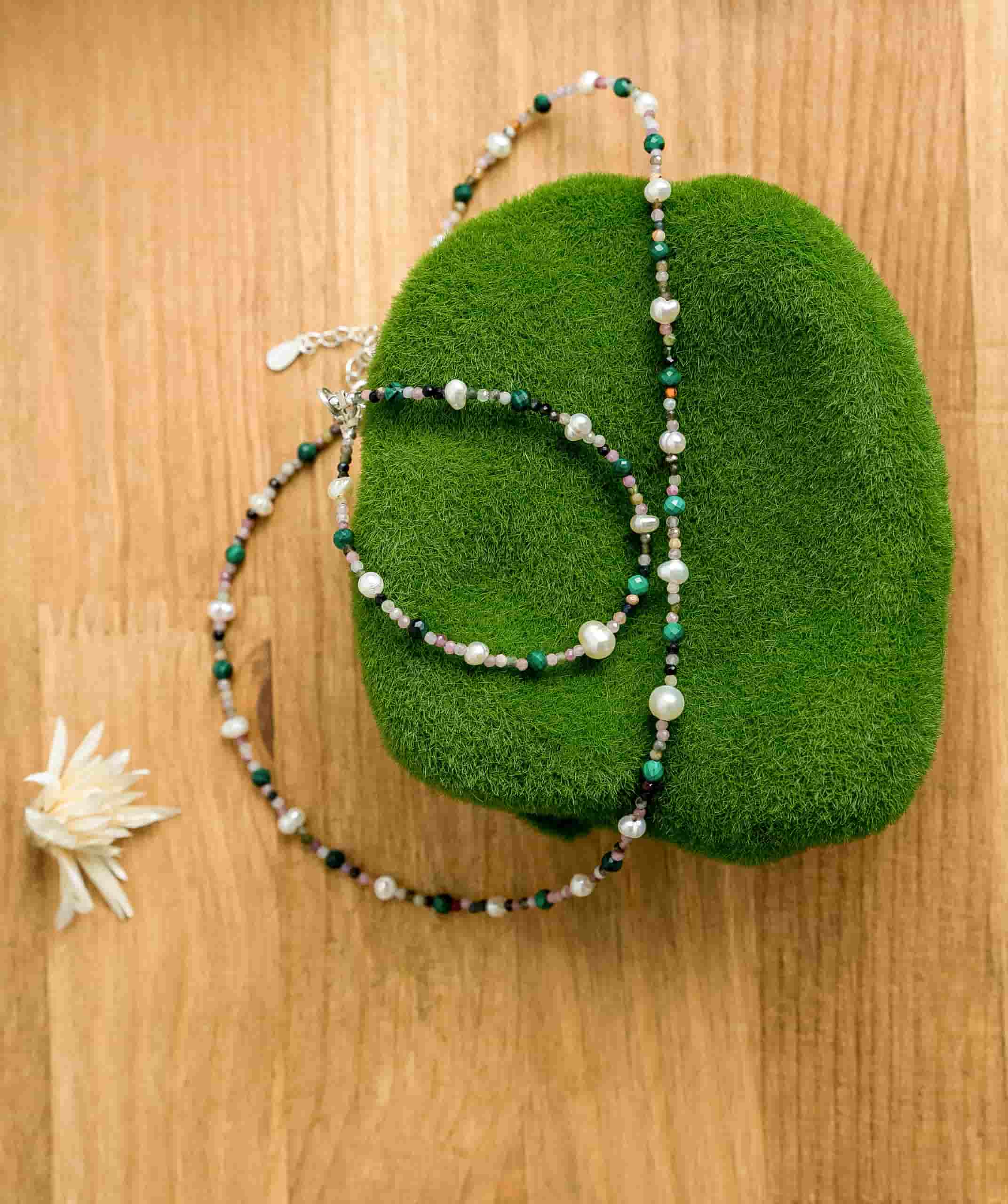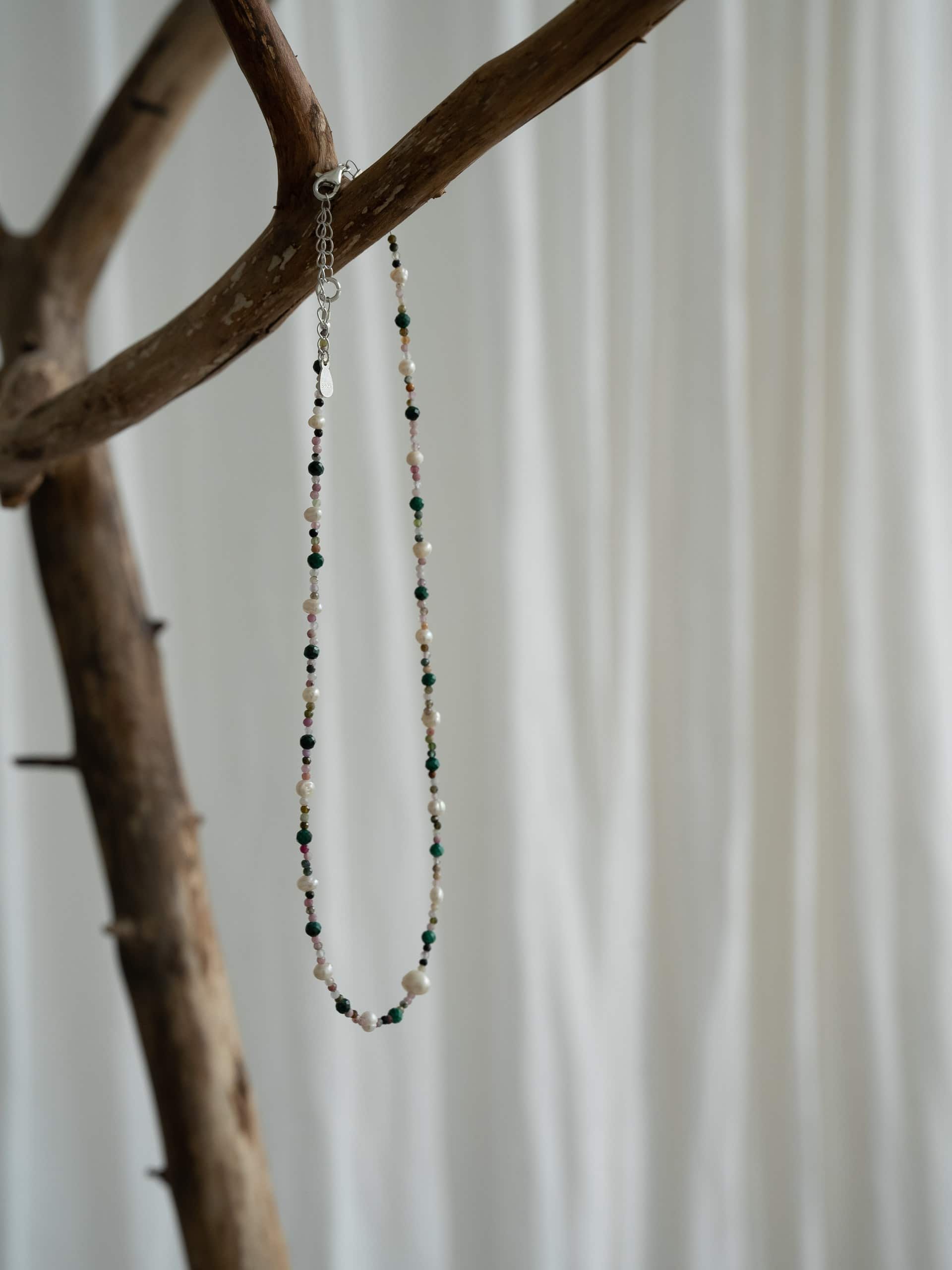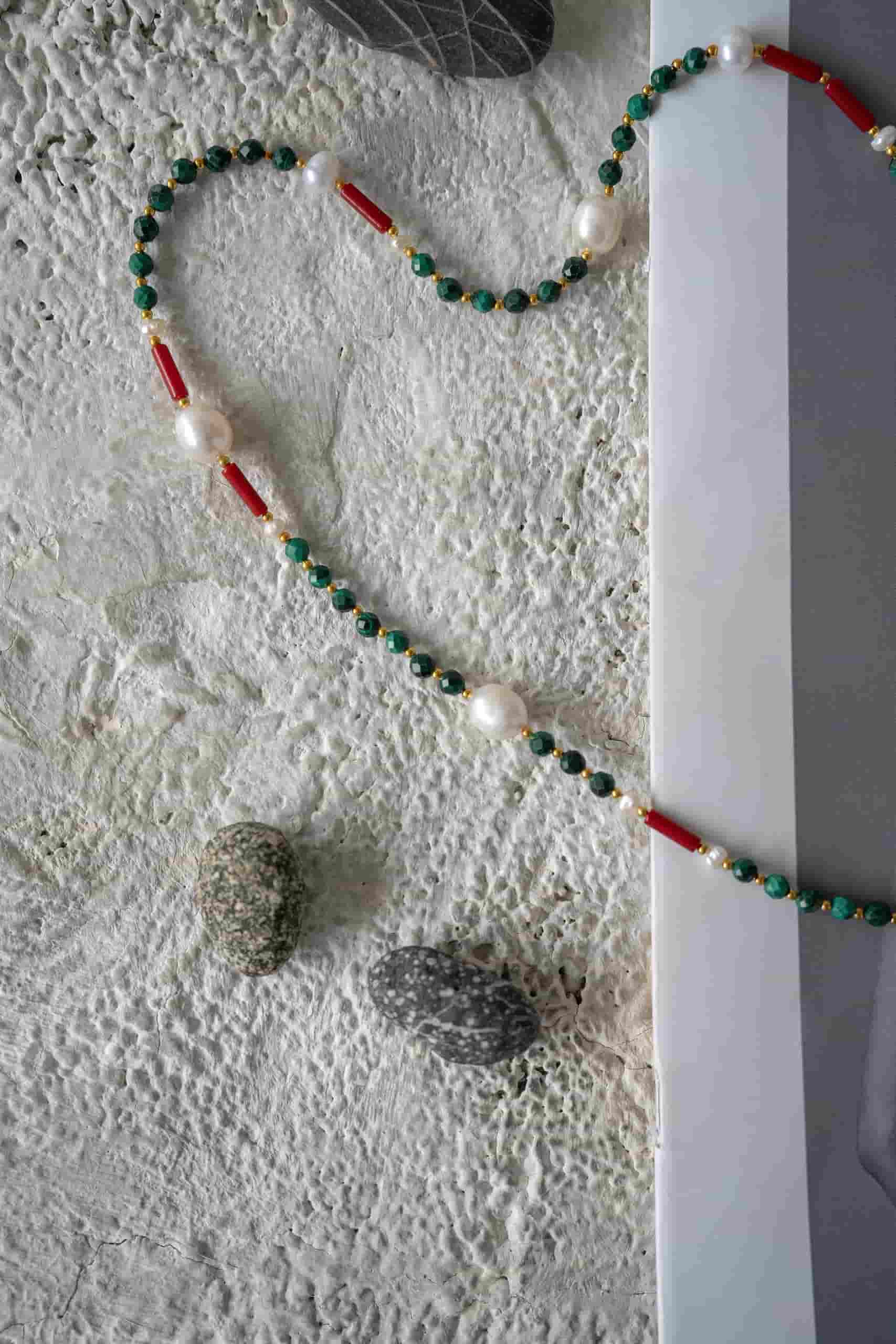 Чокер из турмалина с малахитом и жемчугом