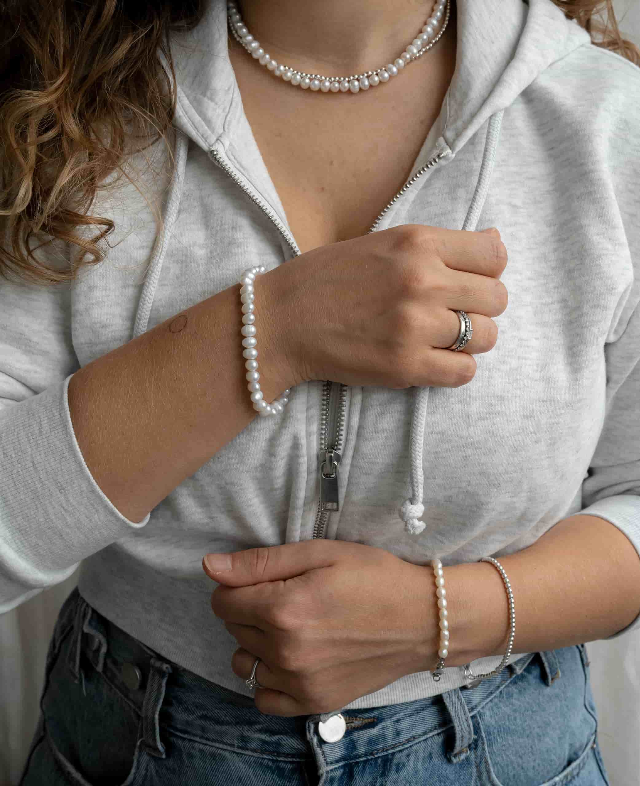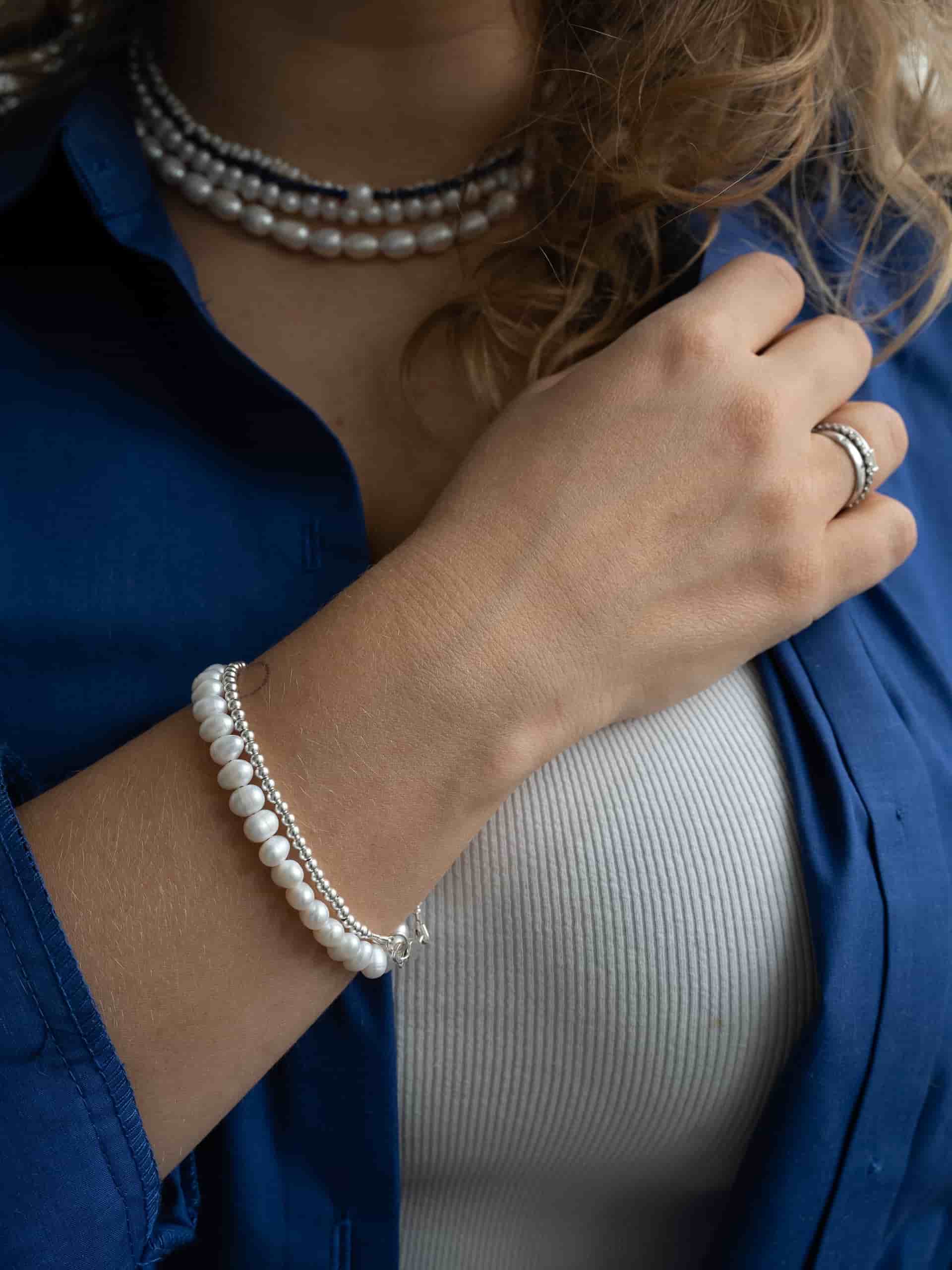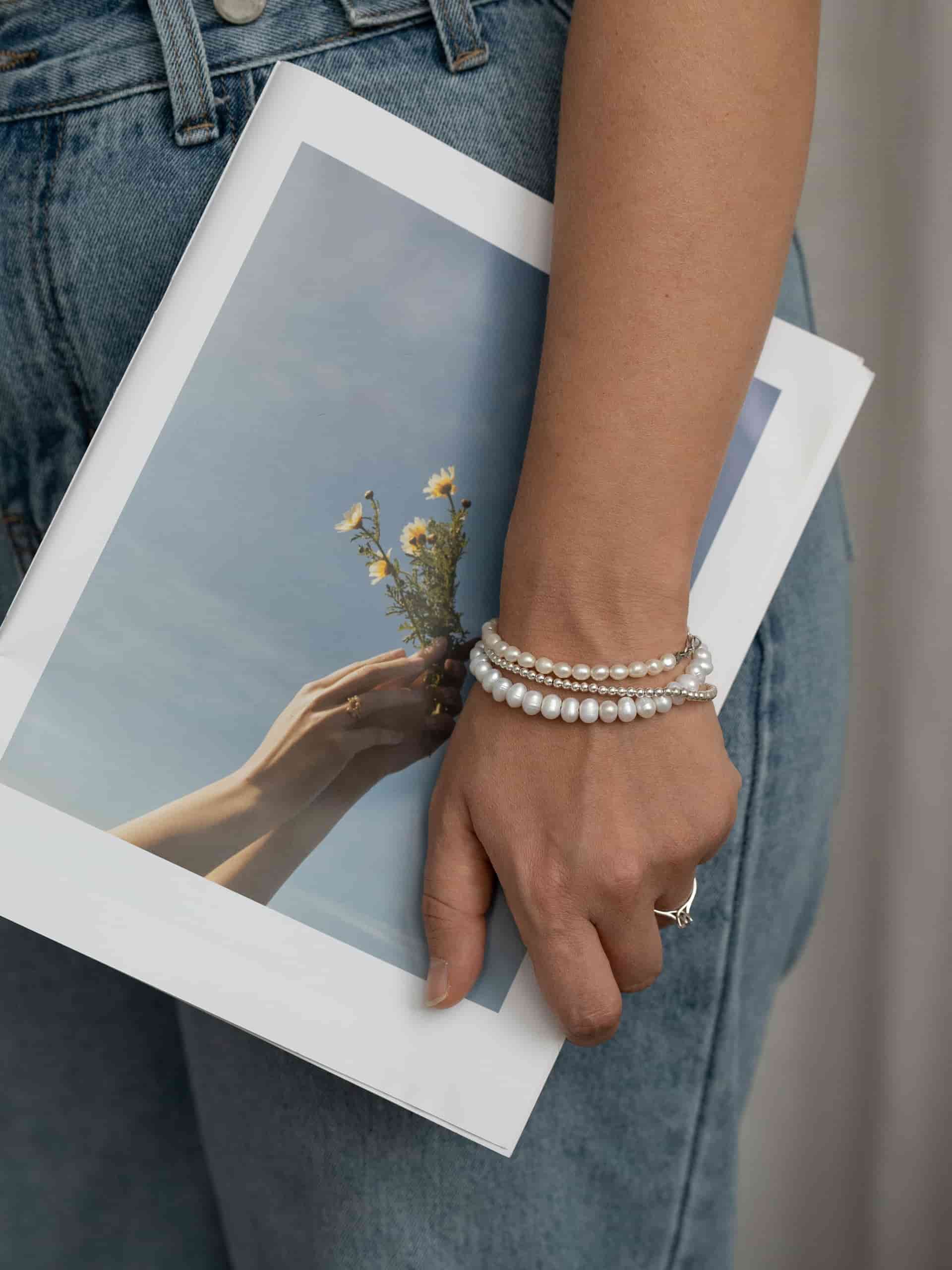 Браслет из речного жемчуга - еще одна классическая вещь. Но что, если попробовать носить его как наборное украшение, как показано в карусели? Это повод присмотреться к другим браслетам Take Five!