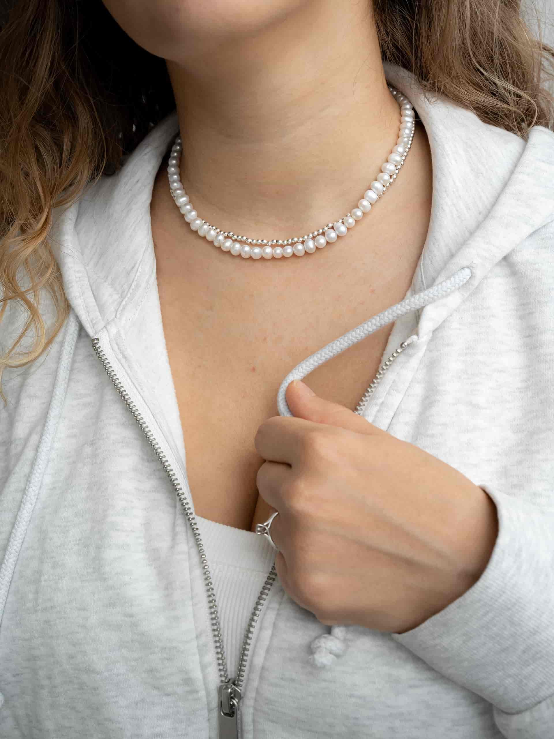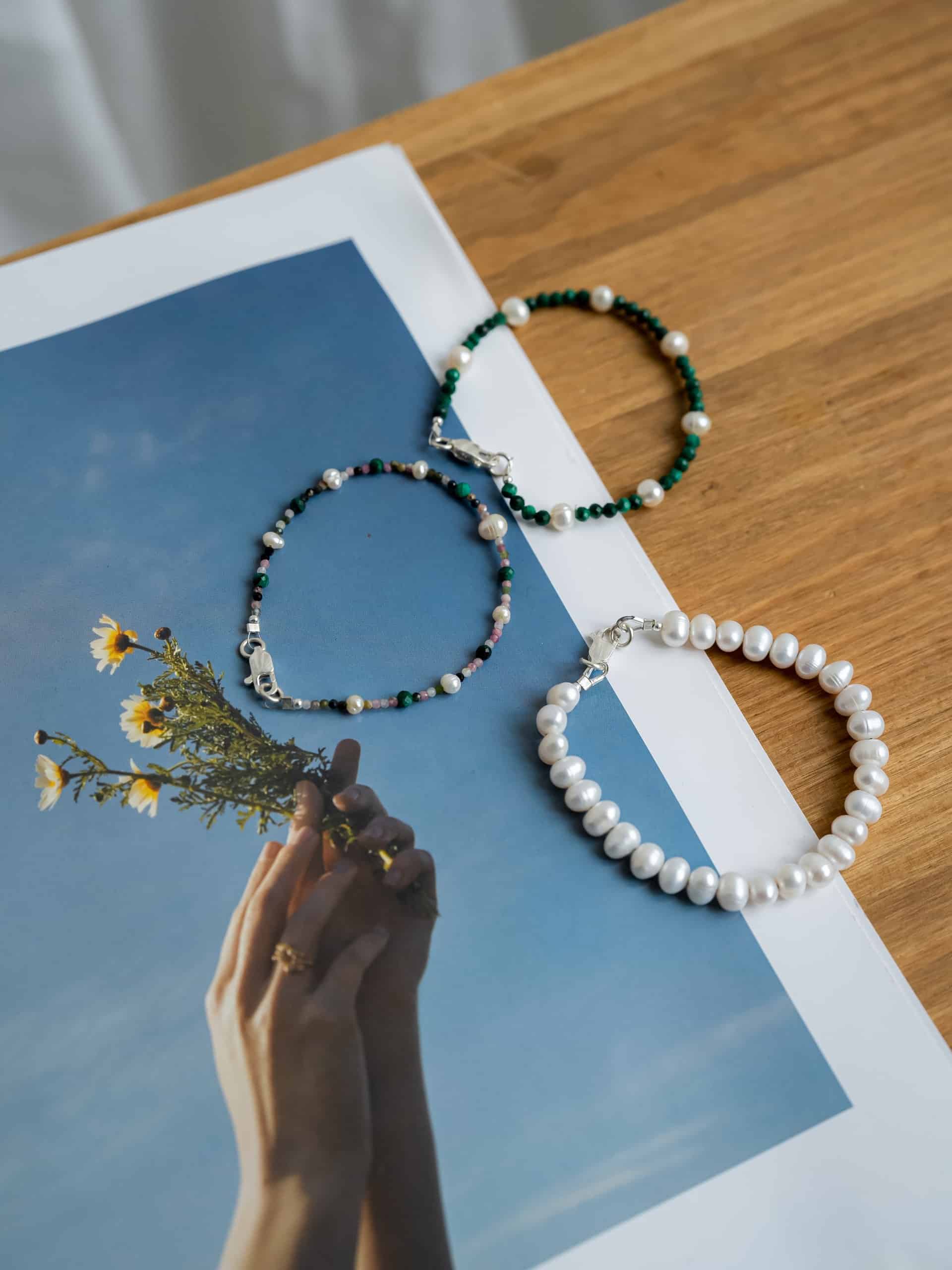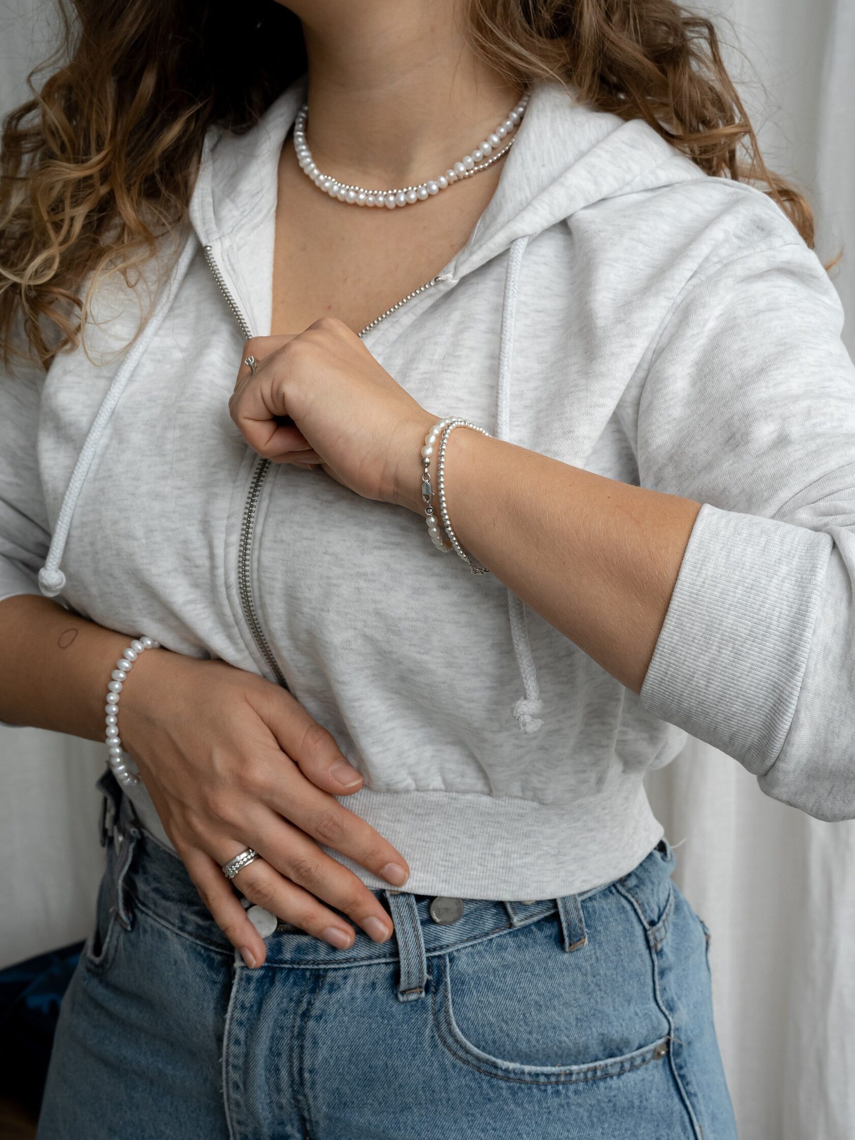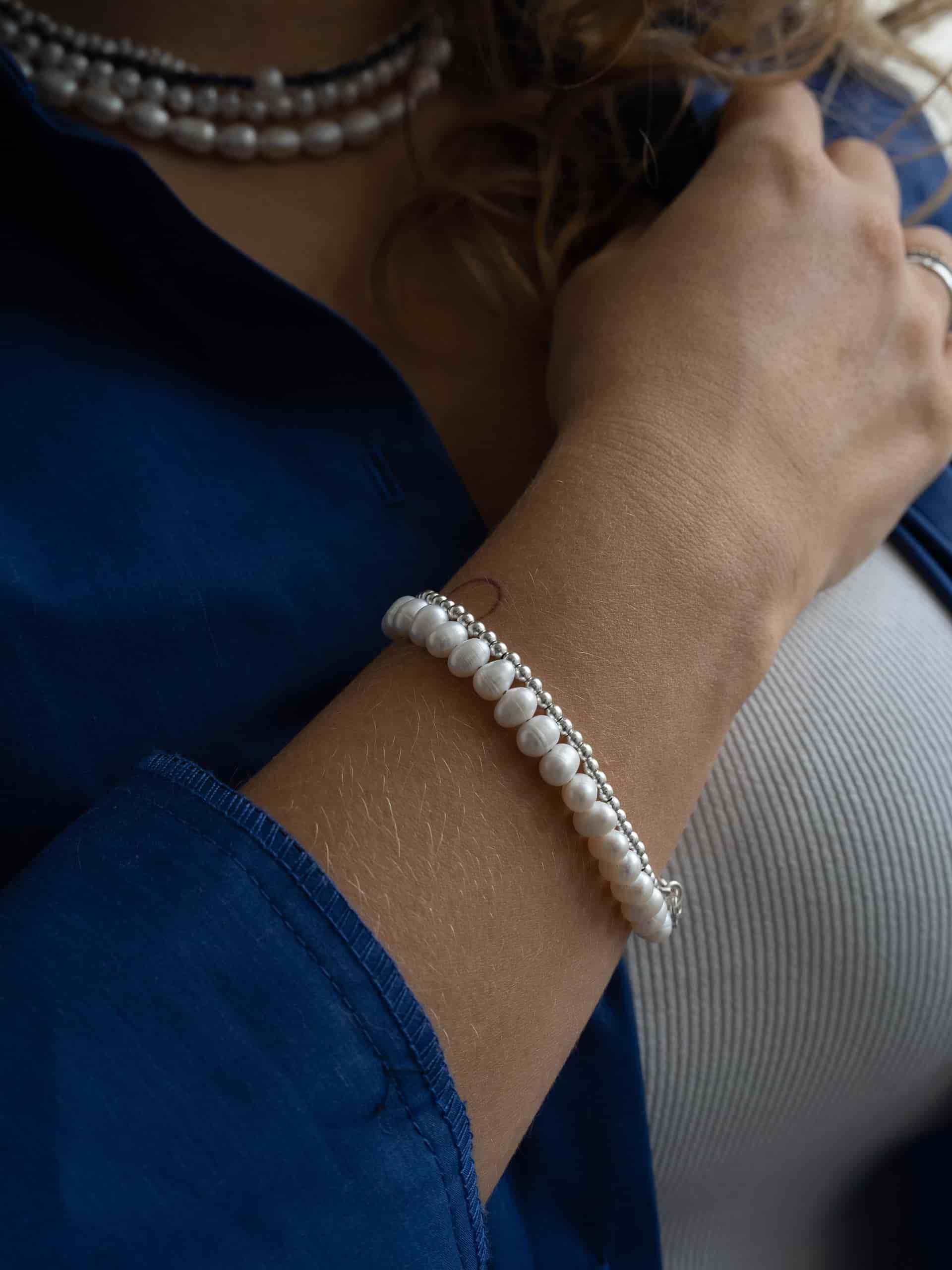 Браслет из речного жемчуга - еще одна классическая вещь. Но что, если попробовать носить его как наборное украшение, как показано в карусели? Это повод присмотреться к другим браслетам Take Five!