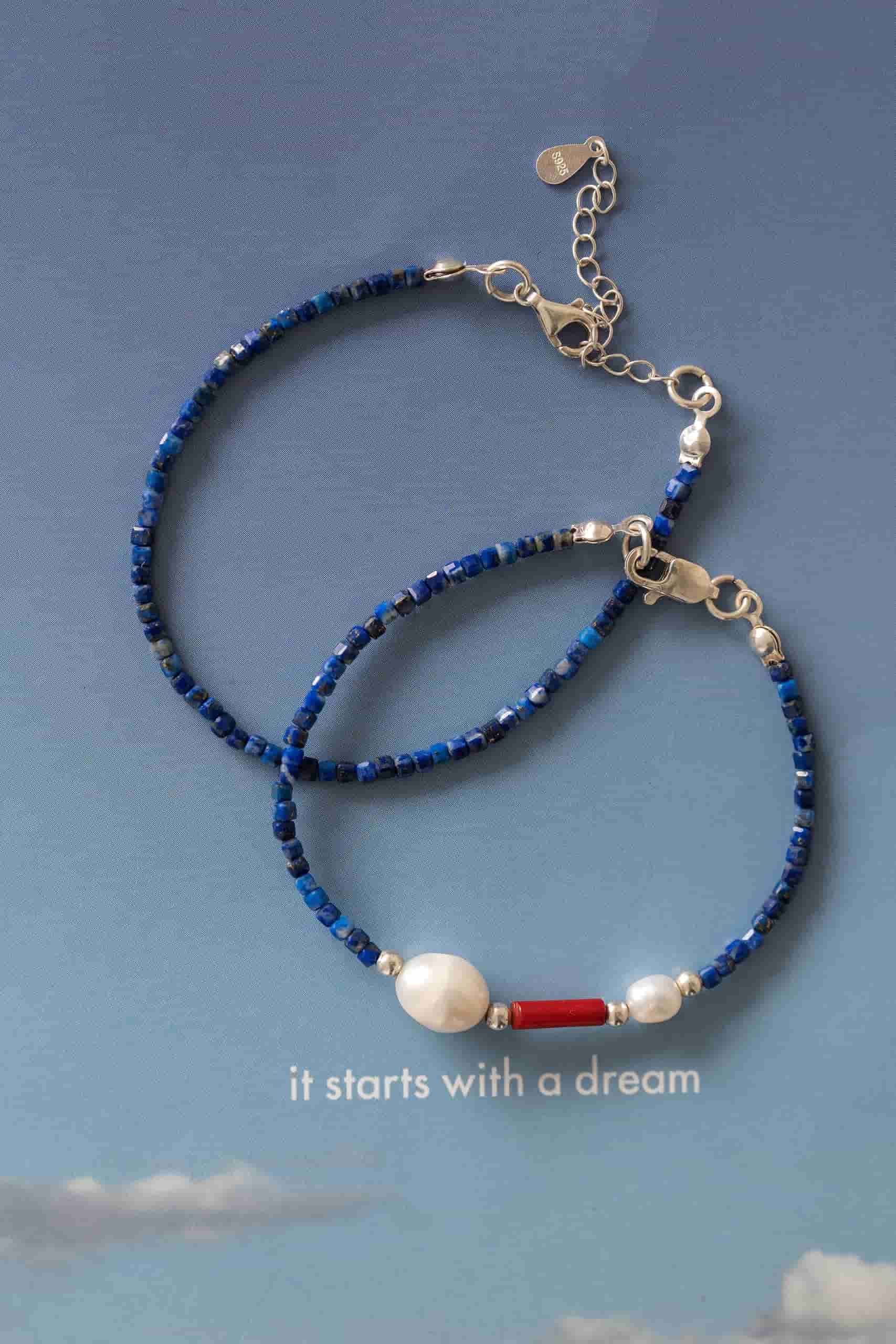 Иногда я думаю о том, что браслет можно надеть как обещание самой себе исполнить свою мечту. Почему бы этому браслету не быть выполненным из мелкого лазурита? А вкрапления из жемчуга и коралла не дадут забыть о задуманном...
