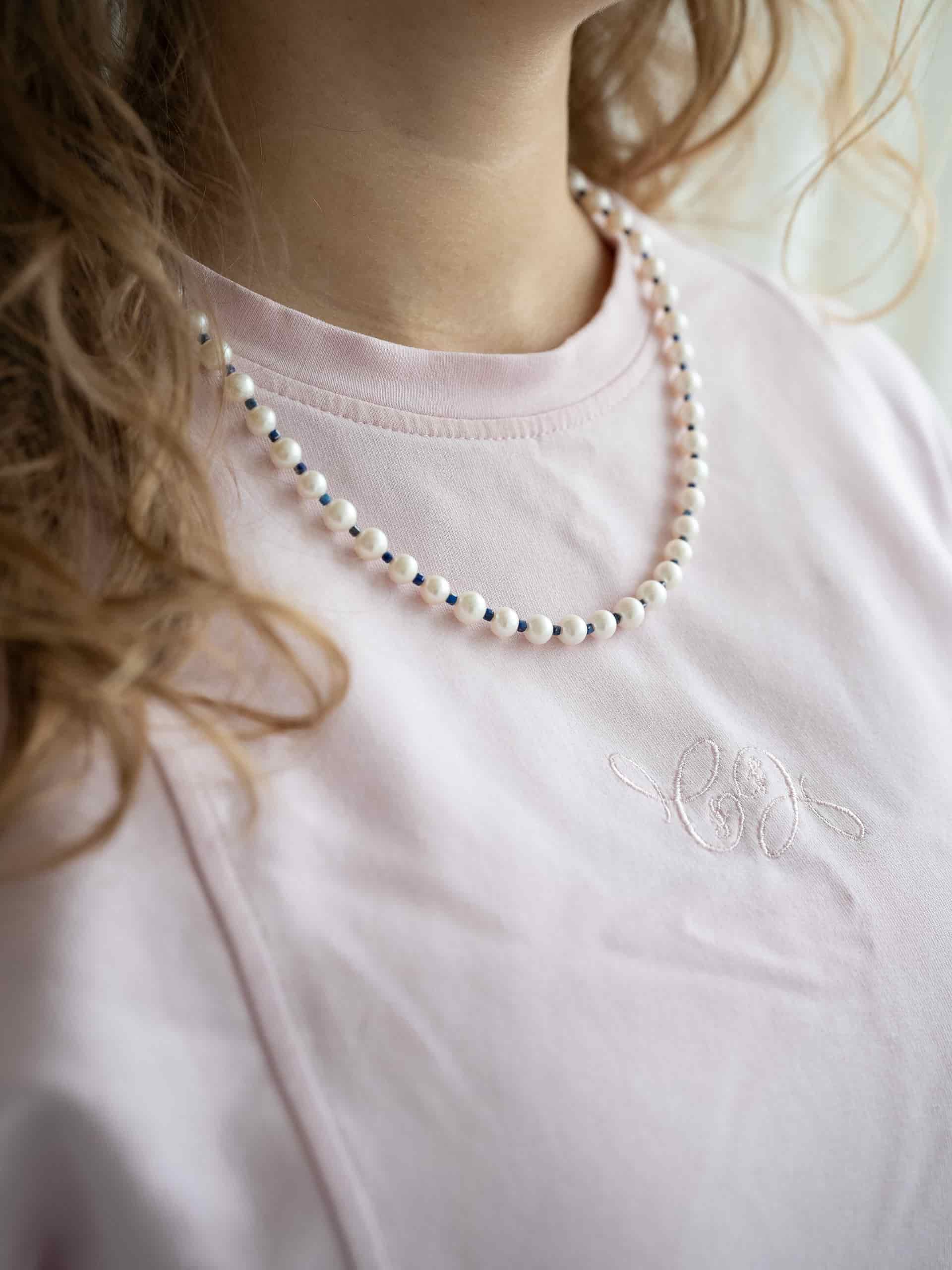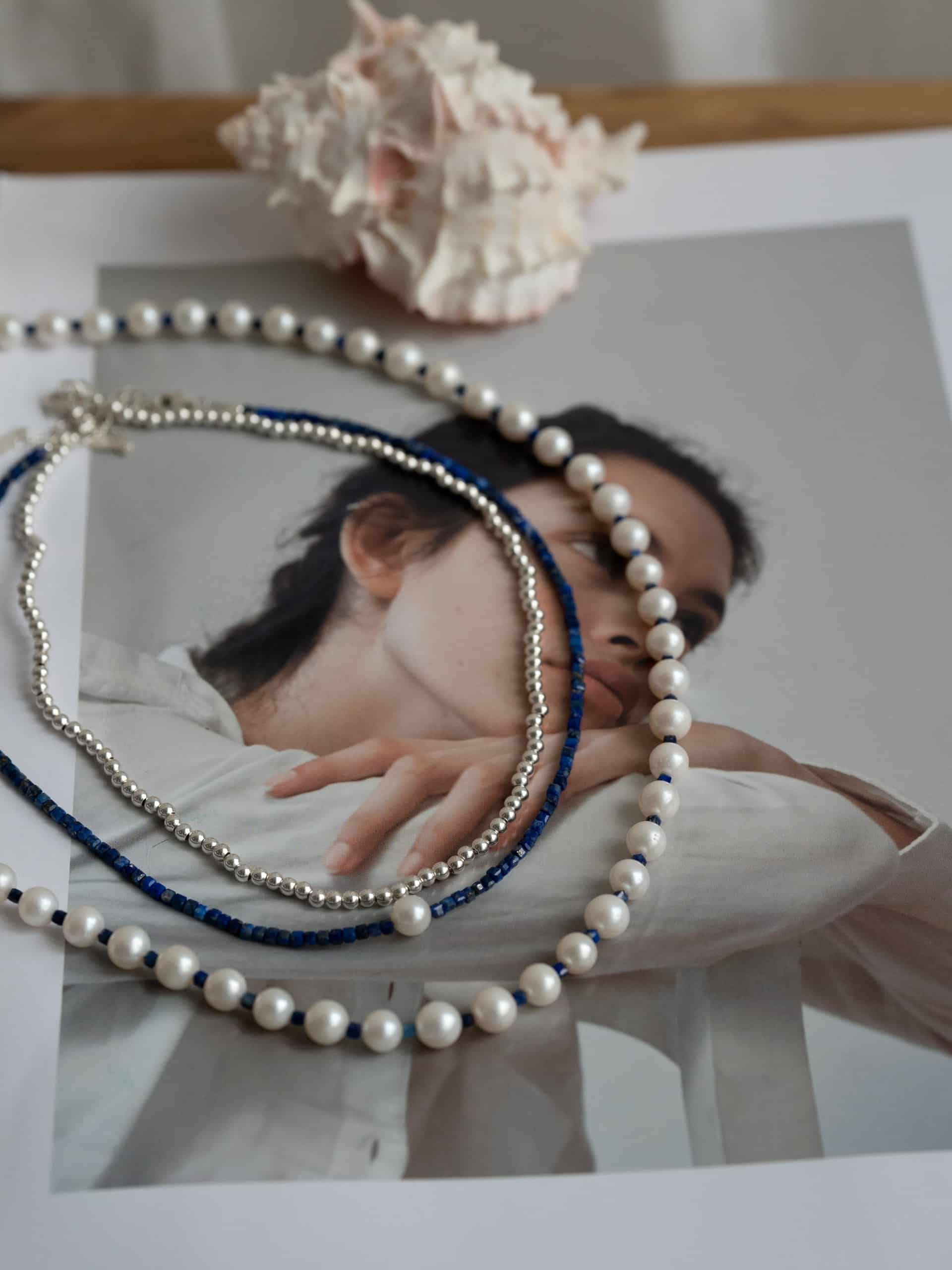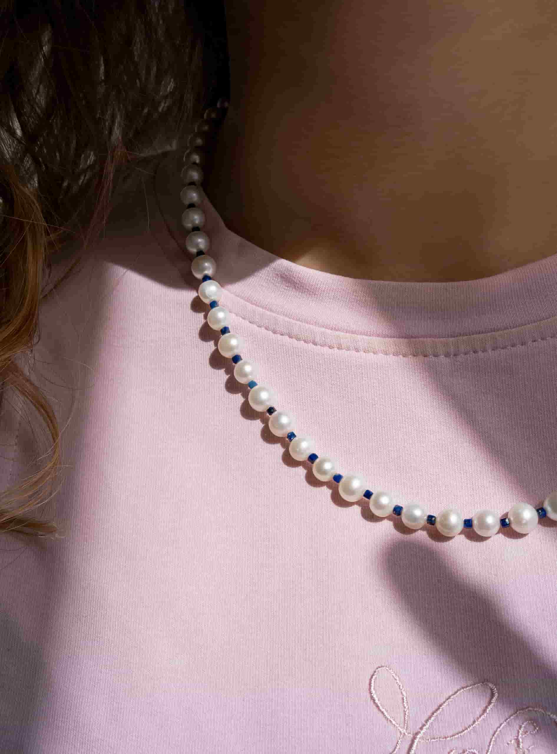Круглый жемчуг - это то, что люди ценят уже веками. Но что, если взять классическую нитку и разбавить ее мелким лазуритом? Получается свежая версия классического украшения самой женственной длины, которую можно насить с закрытыми вещами.
