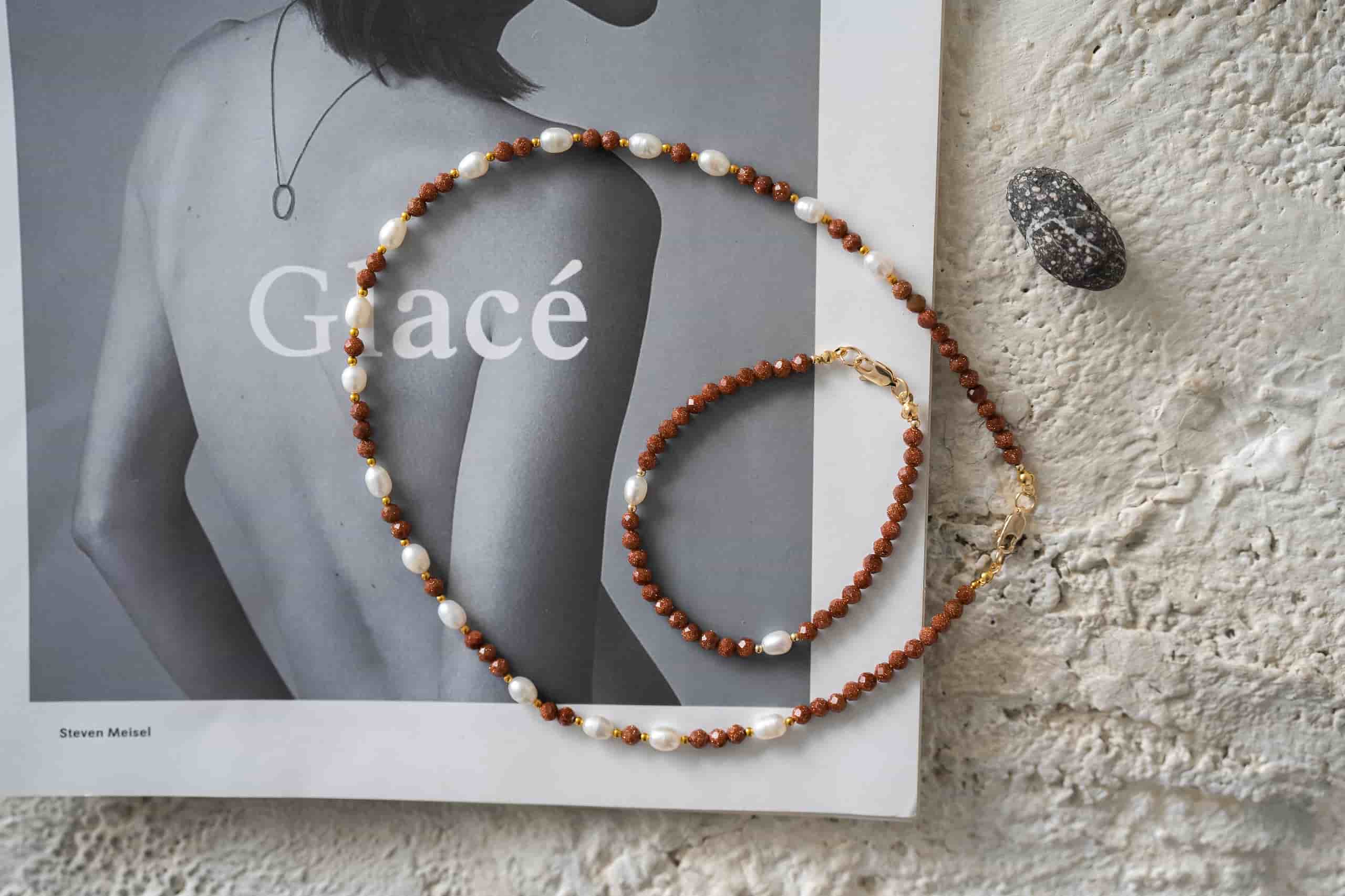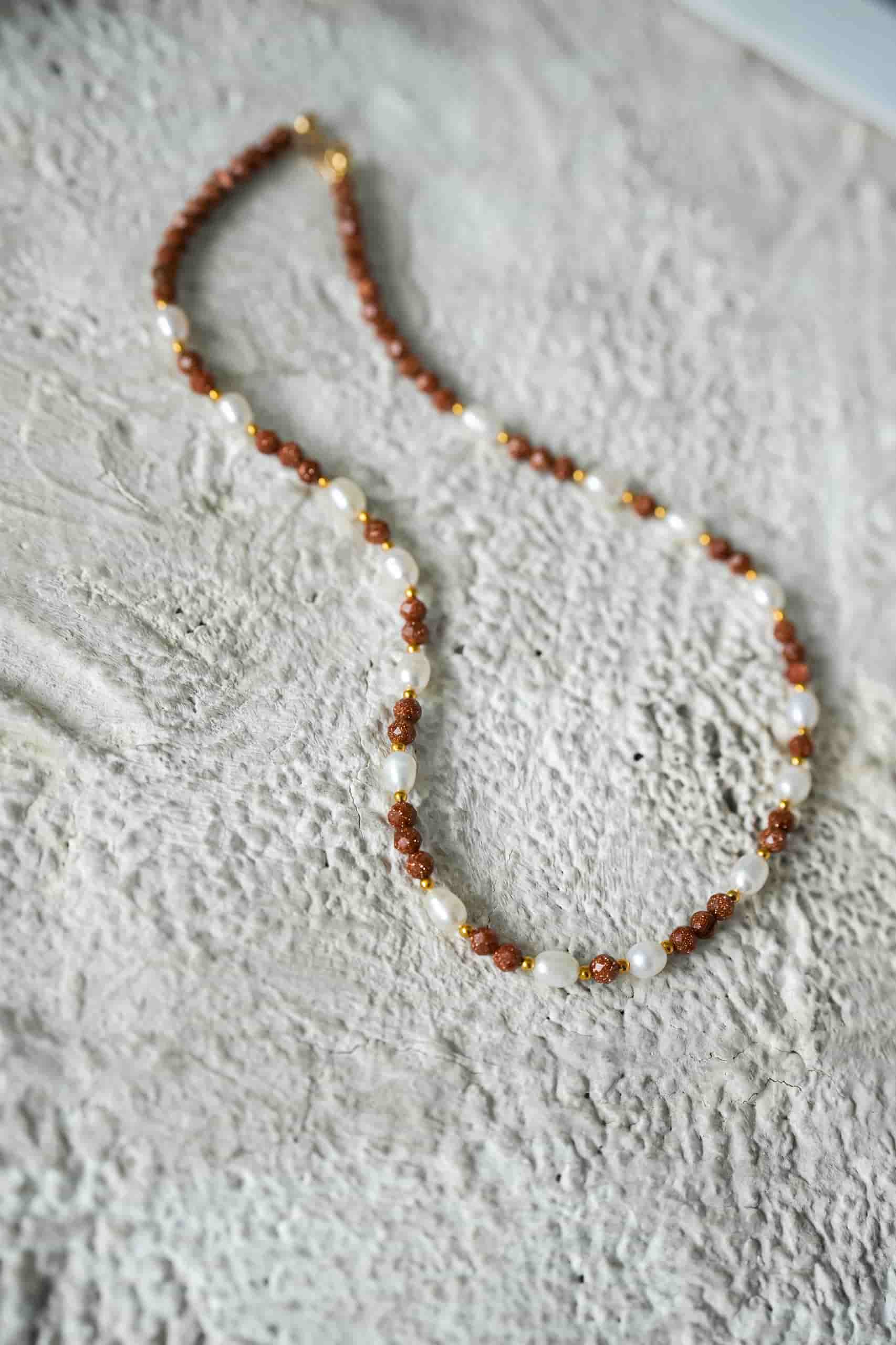 Вы видели когда-нибудь, как сверкает авантюрин? Как будто в камень налили застывшие блестки для лица! Это очень интересно и красиво, но, как по мне, не хватает ярких акцентов, и за них здесь отвечает речной жемчуг! Чокер получился игривым и своеобразным!